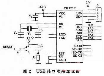 USB接口電路主要由文件管理控制芯片CH376T實(shí)現(xiàn),CH376T支持USB設(shè)備方式和USB主機(jī)方式,并且內(nèi)置了USB通信協(xié)議的基本固件、處理MassStorage海量存儲(chǔ)設(shè)備的專用通信協(xié)議的固件、SD卡的通信接口固件、FAT16和FAT32以及FAT12文件系統(tǒng)的管理固件,支持常用的USB存儲(chǔ)設(shè)備和SD卡。CH376T支持二種通信接口:SPI接口和異步串口。本設(shè)計(jì)采用SPI接口與MCU進(jìn)行數(shù)據(jù)通信,電路連接方式如圖2所示。串行數(shù)據(jù)輸入SDI、輸出SDO和時(shí)鐘SCK分別接STM32F103VC的SPI1_MOSI,SPI1_MISO和SPI1_SCK,中斷請(qǐng)求輸出端INT接PC0,片選端SCS由PA1控制。圖2中的RESET是系統(tǒng)復(fù)位信號(hào),晶體振蕩器Y1選12 MHz。當(dāng)車主要進(jìn)行指紋注冊(cè)/刪除或應(yīng)急點(diǎn)火時(shí),將密碼鑰匙(U盤)接入J1以讀取密碼信息。