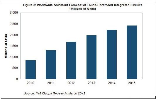在蘋果公司iPhone和iPad暢銷的推動(dòng)下,智能手機(jī)和媒體平板中的觸控屏急劇增長,從而導(dǎo)致觸摸控制器集成電路(IC)出貨量在短短五年內(nèi)將增長近兩倍。