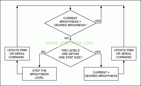 最好不要從一個(gè)亮度級(jí)直接跳轉(zhuǎn)到另一個(gè)亮度級(jí),而是平滑上調(diào)和下調(diào)背光亮度,確保不同亮度等級(jí)之間無縫過渡。為了達(dá)到這一目的,最好采用帶有固定或不同亮度步長(zhǎng)、可逐步調(diào)節(jié)亮度的定時(shí)中斷,也可采用帶有可控制LED輸入電流的PWM值的定時(shí)中斷,或者是能夠發(fā)送到顯示屏控制器的串行指令的定時(shí)中斷。圖8提供了這種算法的一個(gè)示例。