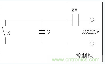 由于開關(guān)K離接觸器KM較遠(yuǎn),兩根電線很長(zhǎng)導(dǎo)致其分布電容C將變得很大,在交流電路中,這個(gè)分布電容中將有位移電流流過,即使開關(guān)K斷開也可能因KM維持能量不需太大而導(dǎo)致KM不釋放,設(shè)備停不下來,此時(shí),可以按以下方法解決: