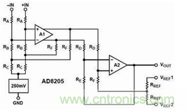 AD8205的內(nèi)部電路由A1和A2兩個(gè)集成運(yùn)放和一個(gè)電阻網(wǎng)絡(luò),以及一個(gè)小參考電壓源和偏置電路構(gòu)成,其電路結(jié)構(gòu)如圖1所示。