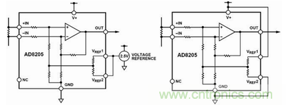雙極性輸出時(shí)AD8205可以測量流過采樣電阻上的雙向電流,這時(shí),輸出可以偏置到輸出范圍內(nèi)的任意位置。當(dāng)被檢測的正反兩個(gè)方向上的電流為等幅時(shí),其輸出必須偏置到滿量程輸出的中間位置。當(dāng)雙向電流幅值不對稱時(shí),輸出偏置可以對應(yīng)地偏離半量程位置。它的兩個(gè)參考輸入VREF1和VREF2分別連接一個(gè)內(nèi)部電阻RREF后接到同一個(gè)內(nèi)部偏置節(jié)點(diǎn),這兩個(gè)參考輸入端的操作方式完全相同。在兩個(gè)參考電壓輸入端接入對應(yīng)的電壓,即可完成對輸出的偏置。在雙極性輸出方式下,一般有以下兩種連接方式。