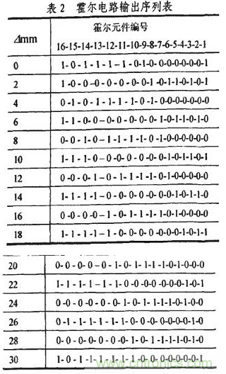 霍爾電路的工作原理是,在外磁場的作用下,當(dāng)磁感應(yīng)強度B超過導(dǎo)通工作點時,霍爾電路輸出管導(dǎo)通,輸出低電-半:若曰值低于釋放點時,輸出管截止,輸出高電半。因此在“凸槽”時鋼質(zhì)活塞桿被磁化,磁感應(yīng)強度曰增加,霍爾電路導(dǎo)通,輸出低電平,用“1”表示;在“凹槽”時輸出高電平,用“0”表示。以第1個霍爾元件為測量基準(zhǔn),從圖2所示時刻起,位移暈旃次變化b=2mm時,一個碼區(qū)行程內(nèi)霍爾電路輸出的二進制序列如表2所示。分析可知,序列的標(biāo)識碼為l 0000000 1,其前面或后面6位序列數(shù)分別為相鄰的兩個數(shù)值碼,這使它具有很強的容錯能力。標(biāo)識碼每隔一個霍爾元件間距N在低位部分右移一位。值得注意的是,標(biāo)識碼前面的數(shù)值碼代表磁性標(biāo)尺當(dāng)前檢測位置下一個碼區(qū)的值。