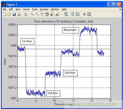 圖2所示是在意法半導(dǎo)體的意大利Castelletto寫字樓內(nèi)采集到的壓力傳感器數(shù)據(jù)。采樣速率是7Hz,數(shù)據(jù)采集時(shí)間總計(jì)大約23分鐘。從圖中我們可以清晰地看到大氣壓在不同樓層的變化。大氣壓在地下室最高。隨著樓層升高,大氣壓逐漸降低。