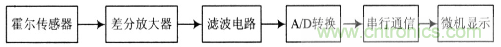 系統(tǒng)可以分為3個(gè)部分。第一部分是信號源,由霍爾傳感器產(chǎn)生電壓信號,信號通過差分放大,濾波得到較清晰的信號;第二部分是信號經(jīng)過A/D轉(zhuǎn)換送入單片機(jī)進(jìn)行處理,再通過串行通信送入PC機(jī)處理得到結(jié)果;第三部分是數(shù)據(jù)的顯示,這部分是通過VB的繪圖程序來完成,顯示結(jié)果以v-x關(guān)系圖來顯示。系統(tǒng)總流程如圖1所示。