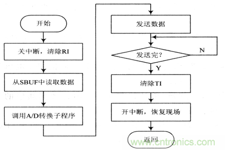 由于單片機(jī)多應(yīng)用于實(shí)時(shí)性較強(qiáng)的控制場合,為了盡量少占用CPU的時(shí)間,充分發(fā)揮CPU的功能。該系統(tǒng)在單片機(jī)程序設(shè)計(jì)中采用中斷方式與PC機(jī)進(jìn)行通信。主程序只進(jìn)行串行通信、數(shù)碼管實(shí)時(shí)顯示、模/數(shù)轉(zhuǎn)換結(jié)果的初始化和循環(huán)等待串行中斷工作,當(dāng)接收到PC機(jī)發(fā)來的信號時(shí),就轉(zhuǎn)人中斷服務(wù)程序,進(jìn)行A/D轉(zhuǎn)換,并向Pc機(jī)發(fā)送數(shù)據(jù)。中斷服務(wù)子程序流程圖如圖6所示。