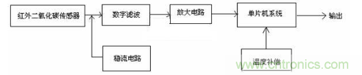 檢測電路由紅外二氧化碳傳感器、數(shù)字濾波電路、放大電路、穩(wěn)流電路、單片機系統(tǒng)、溫度補償?shù)冉M成?;驹硎羌t外二氧化碳傳感器將檢測到的二氧化碳氣體濃度轉(zhuǎn)換成相應(yīng)的電信號,輸出的電信號分別經(jīng)過濾波、放大處理,輸入到單片機系統(tǒng),并經(jīng)溫度和氣壓補償?shù)忍幚砗螅蓡纹瑱C系統(tǒng)輸出送顯示裝置顯示其測量值。