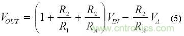注意,從VA至輸出的增益為反相。VA的增加會使輸出電壓降低,比值為R2和RA之比。此比值下,可以針對給定的輸入失調(diào),使調(diào)整范圍達(dá)到最大。由于調(diào)整范圍指向增益之前的放大器輸入,因此,即使在低分辨率源的情況下,也可實(shí)施微調(diào)。由于RA一般都比R1大得多,因此,我們可以得到等式(5)的近似值: