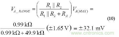 由于DAC可以擺動±1.65 V,因此,總失調(diào)調(diào)整范圍可通過由RA 以及R1和R2的并聯(lián)組合形成的分壓器給定,其計(jì)算方法如下: