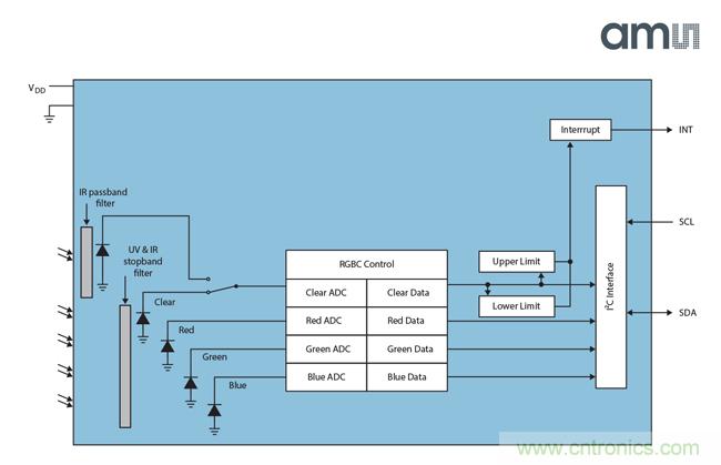 四個獨(dú)立的模擬數(shù)字轉(zhuǎn)換器(ADC)分別對應(yīng)一個RGB通道, C通道和紅外線通道共用第四個模擬數(shù)字轉(zhuǎn)換器。四個通道同時取樣能避免快速變化的光照條件下CCT和光照強(qiáng)度的測量出錯。TCS3490傳感器的光電二極管被安排在一個輻射狀結(jié)構(gòu)上,因此光線從任意方向射入都能獲得一致的有效響應(yīng),尤其是從圓形的窗口中射入的光。當(dāng)光線測量值或顏色測量值超過預(yù)設(shè)的閾值時,傳感器會向處理器發(fā)送中斷信號,避免處理器不停地通過I2C接口輪詢,幫助降低整個系統(tǒng)的功耗,延長電池壽命。