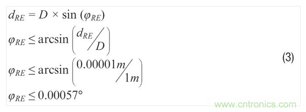 回過頭看圖2中的應(yīng)用示例,將公式1和公式2結(jié)合便可把重要標(biāo)準(zhǔn)(檢查表面上的物理失真)與MEMS陀螺儀數(shù)據(jù)手冊通常會提供的噪聲性能指標(biāo)(RND、ARW)關(guān)聯(lián)起來。在此過程中,假設(shè)公式1中的積分時(shí)間 (τ) 等于圖像捕捉時(shí)間可提供進(jìn)一步且很有用的簡化。公式3利用公式1中的一般關(guān)系來估 計(jì),當(dāng)攝像頭距檢查表面1米 (D) 且最大容許失真誤差為10μm (dRE) 時(shí),陀螺儀的角向誤差 (φRE) 必須小于0.00057°。