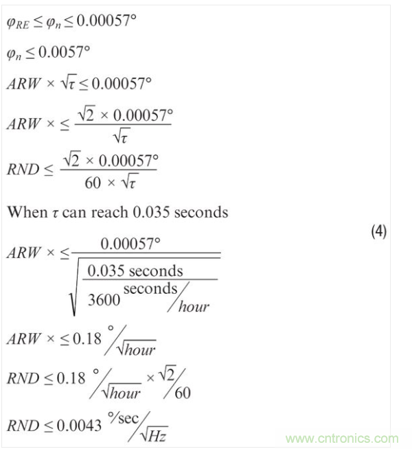 公式4將公式3的結(jié)果和公式2中的一般關(guān)系相結(jié)合,用來預(yù)測特定情況下對MEMS陀螺儀的ARW和RND要求。該過程假設(shè)圖像捕捉時(shí)間35 ms等于公式2中的積分時(shí)間 (τ),因而可以預(yù) 測,為了達(dá)到要求,陀螺儀的ARW需要小于0.18°/ hr,或者RND必須小于0.0043°/sec/ Hz。當(dāng)然,這可能不是這些參數(shù)支持的唯一要求,但這些簡單的關(guān)系提供了一個(gè)例子,告訴我們?nèi)绾螌⑵渑c已知要求和條件聯(lián)系起來。