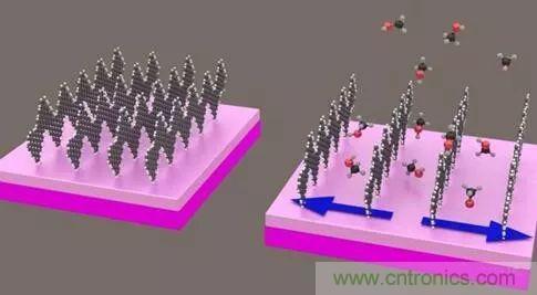 這張圖片呈現(xiàn)了氣體分子如何擴(kuò)大團(tuán)隊(duì)石墨烯納米帶行與行之間的間隙。內(nèi)布拉斯加州材料與納米科學(xué)中心的AlexanderSinitskii及其同事已經(jīng)提出這種現(xiàn)象部分地解釋了納米帶如何為傳感器提供前所未有的靈敏度Sinitskii和他的同事懷疑納米帶的顯著性能部分來(lái)源于納米帶和氣體分子之間非同尋常的相互作用。不同于他們的前輩,該團(tuán)隊(duì)的納米帶排列整齊,類(lèi)似于查理布朗的條紋襯衫般垂直放置,而不是平躺在表面。該團(tuán)隊(duì)指出,氣體分子可以將這些行列分開(kāi),有效地延長(zhǎng)了納米帶之間的間隙,幫助電子跳躍到導(dǎo)電區(qū)。加入(苯)環(huán)