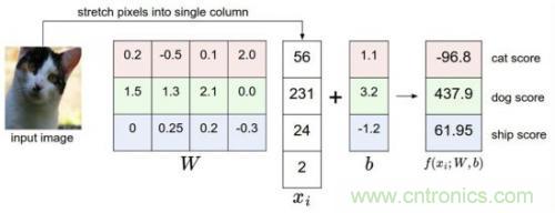 比如我們有訓練數(shù)據(jù)集照片對應著cat、dog、ship三個類別,某個輸入照片經(jīng)過函數(shù)f(x)=x*W+b,前向運算得到該照片屬于這3個分類的得分值。此時,這個函數(shù)被稱為得分函數(shù),如下圖所示,假設(shè)左邊關(guān)于貓的input image是一個4維向量[56,231,24,2],而W權(quán)重是一個4*3的矩陣,那么相乘后再加上向量[1.1,3.2,-1.2]可得到在cat、 dog、ship三個類別上的得分: