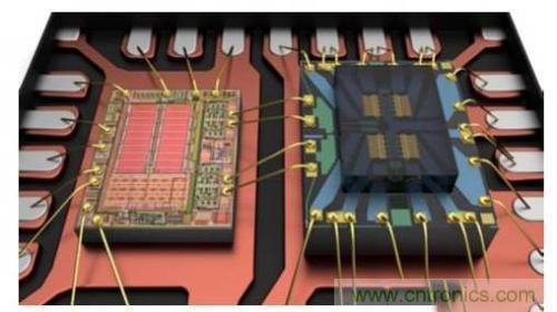 圖四 : 驅(qū)動(dòng)IC(左側(cè)),MEMS開關(guān)芯片(右側(cè))被黏著和線焊至金屬導(dǎo)線架上