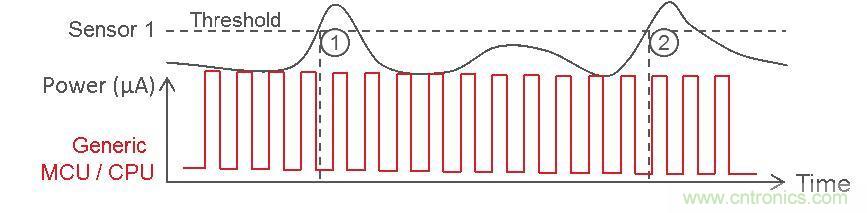 當(dāng)外部事件超過(guò)傳感器閾值時(shí)才喚醒 CPU 并不是一個(gè)革命性的概念。本質(zhì)上,它會(huì)將恒定的 MCU 工作周期從圖 1 中移至單個(gè)事件;當(dāng)模擬事件超過(guò)給定閾值時(shí),MCU 蘇醒并執(zhí)行各種行動(dòng)。