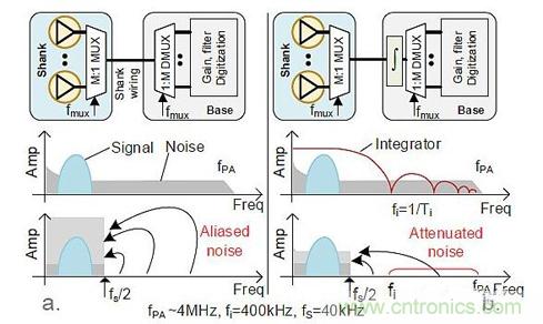 神經(jīng)探針的信號帶寬約為7.5kHz,可以采用15kHz對PA輸出采樣。設(shè)計人員發(fā)現(xiàn)可以將時分復用技術(shù)嵌入柄中(圖4a)。這樣做可以使每個獨特的柄線上有M個PA輸出。如果沒有加抗混疊濾波器進行限制,則PA帶寬會由于折疊而產(chǎn)生帶內(nèi)噪聲。在采樣發(fā)生之前,將低通濾波器裝入這個小PA區(qū)域是不可能的。設(shè)計人員選擇使用能夠在Ti時間段對信號進行積分的架構(gòu)(圖4b)來衰減超出采樣頻率fi的信號,從而提高信噪比(SNR)。