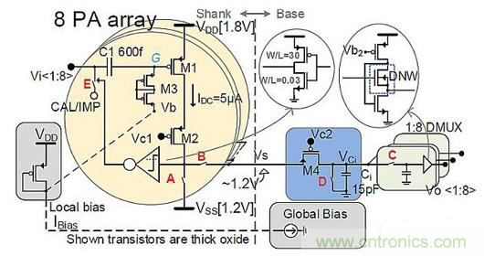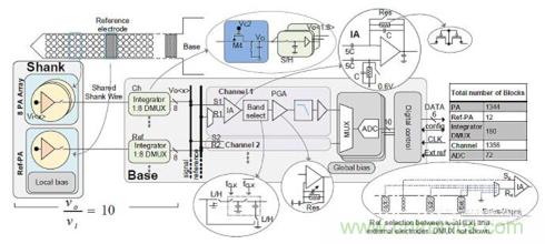 探針架構(gòu)設(shè)計(圖5)中的信號流,通過一條共享柄線從8個多路復用PA陣列的輸出流向底座。然后,該信號進入探針底座中的積分器,積分器的輸出通過8個標記為Vo的采樣保持電路進行解復用。接下來,8個單獨的Vo中的每一個都進入自己的信道模塊,它們對信號進行放大和濾波,使得輸出僅有感興趣的頻帶。接下來,所有20個通道經(jīng)過多路復用并由10位逐次逼近寄存器式(SAR)模數(shù)轉(zhuǎn)換器(ADC)進行數(shù)字化,并發(fā)送至為ADC和多路復用/多路解復用器(MUX/DEMUX)提供時鐘的數(shù)字控制模塊。在此,所有ADC的并行輸出經(jīng)串行化后僅有6條數(shù)據(jù)線。