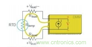 與熱敏電阻相似,鉑電阻溫度傳感器(RTD)也是用鉑制成的熱敏感電阻。當(dāng)通過測量電壓計算RTD 溫度時,數(shù)字萬用表用已知電流源測量該電流源所產(chǎn)生的電壓。這一電壓為兩條引線(Vlead)上的壓降加RTD上的電壓(Vtemp)。例如,常用RTD 的電阻為100Ω,每1℃僅產(chǎn)生0.385Ω的電阻變化。如果每條引線有10Ω電阻,就將造成26℃的測量誤差,這是不可接受的。所以應(yīng)對RTD作4線歐姆測量。