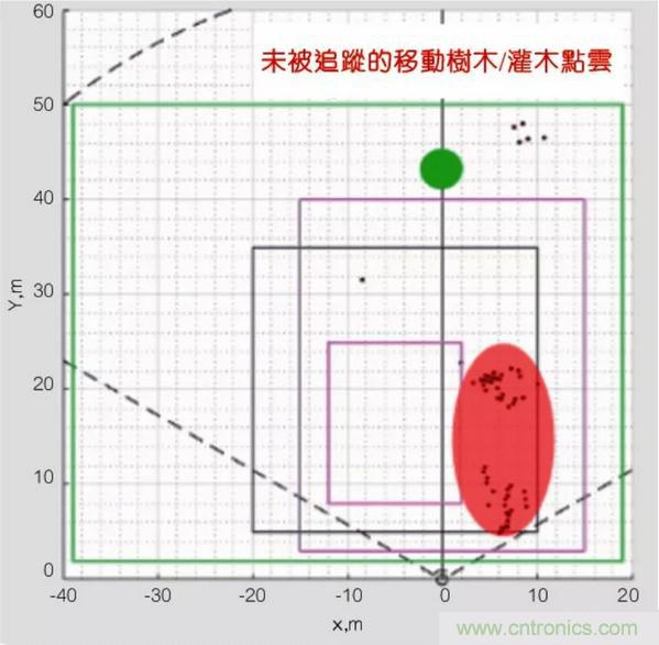 圖2顯示了使用毫米波技術(shù)的入侵探測(cè);毫米波傳感器分析場(chǎng)景中物件的速度,過(guò)濾出移動(dòng)背景中的運(yùn)動(dòng),僅追蹤人物。